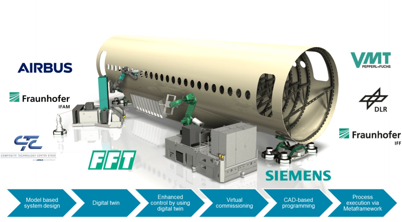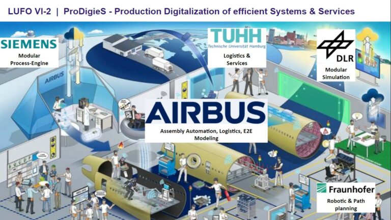 Im Verbundprojekt „Prodigies“ erarbeiten die Partner Siemens AG, Fraunhofer IFAM, DLR und TUHH unter der Leitung von Airbus gemeinsam Lösungen, wie durch den Einsatz intelligenter, vernetzter und modularer Robotersysteme die Effizienz in der Flugzeugproduktion gesteigert werden kann. Das DLR-Institut für Systemdynamik und Regelungstechnik steuert Simulationskomponenten zur virtuellen Produktionsanlage bei, die es den Projektpartnern ermöglichen, Teile der Anlage vorab simulativ zu bewerten. Insbesondere die Lokomotion und Manipulator-Auslegung kann in der Simulation frühzeitig abgesichert werden. Darüber hinaus werden Simulationsmodelle für die Anlagensimulation sowie dazugehörige Visualisierungsmodelle entwickelt. Die Modelle sollen genutzt werden, um die virtuelle Inbetriebnahme direkt aus der Anlagensteuerung heraus zu demonstrieren sowie zur Vorabsimulation von Prozessschritten.